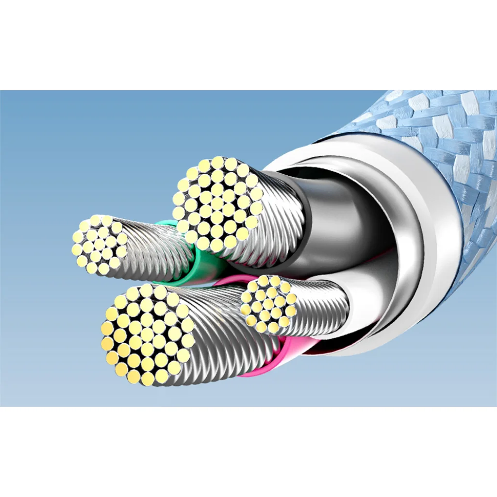 A kábel kiváló minőségű anyagokból, például fonott PVC-ből és pamutból készült, ami garantálja a tartósságot és a mechanikai sérülésekkel szembeni ellenállást. A több mint 30 000 ismétléssel végzett hajlítási tesztek megerősítik a napi használat során tanúsított ellenállását. Ezenkívül az esztétikus színű, modern kialakítás tökéletesen illeszkedik a különböző eszközökhöz.