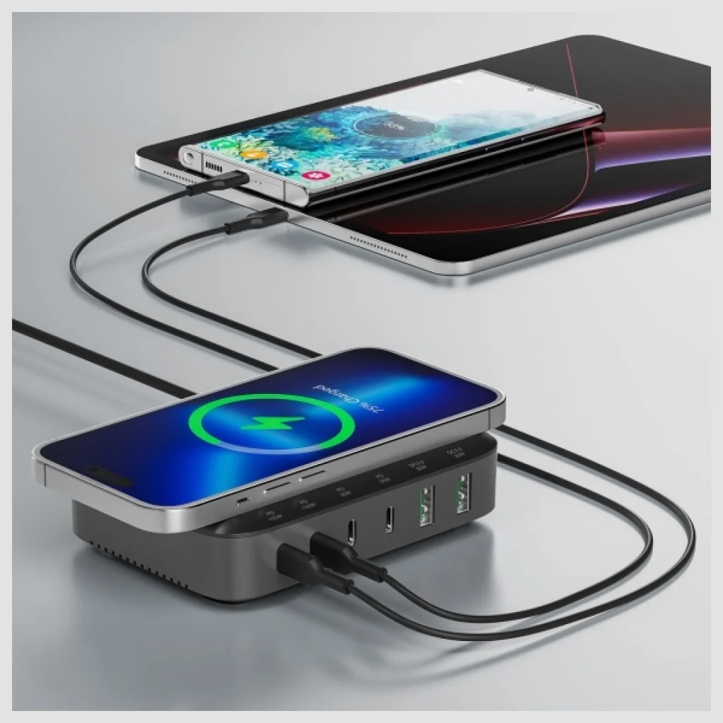 Töltse fel összes mobil eszközét, mint például a laptopot, táblagépet, okostelefont, okosórát és más kiegészítőket egyetlen kompakt töltővel. A lenyűgöző 100W kimeneti teljesítménnyel egyszerre akár 7 eszközt is tölthet – mind Apple, mind Android készülékeket.