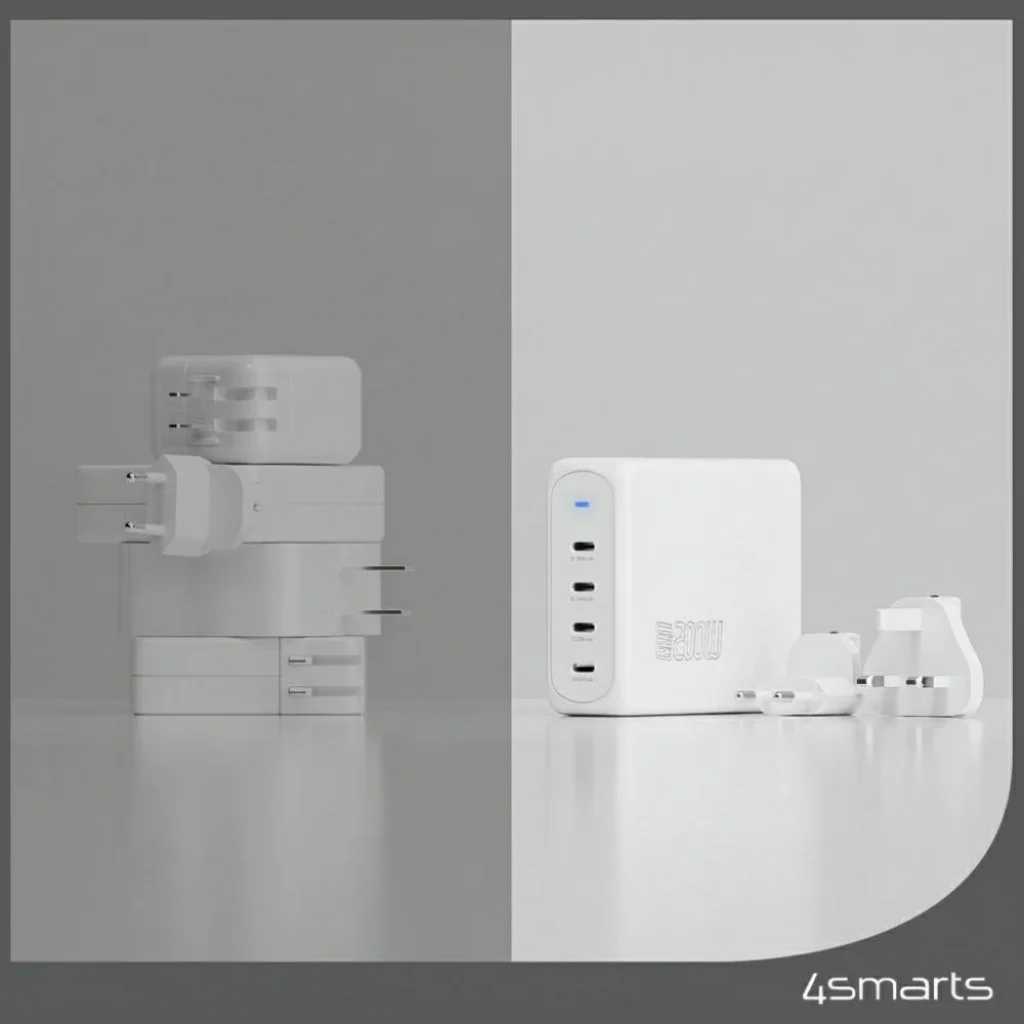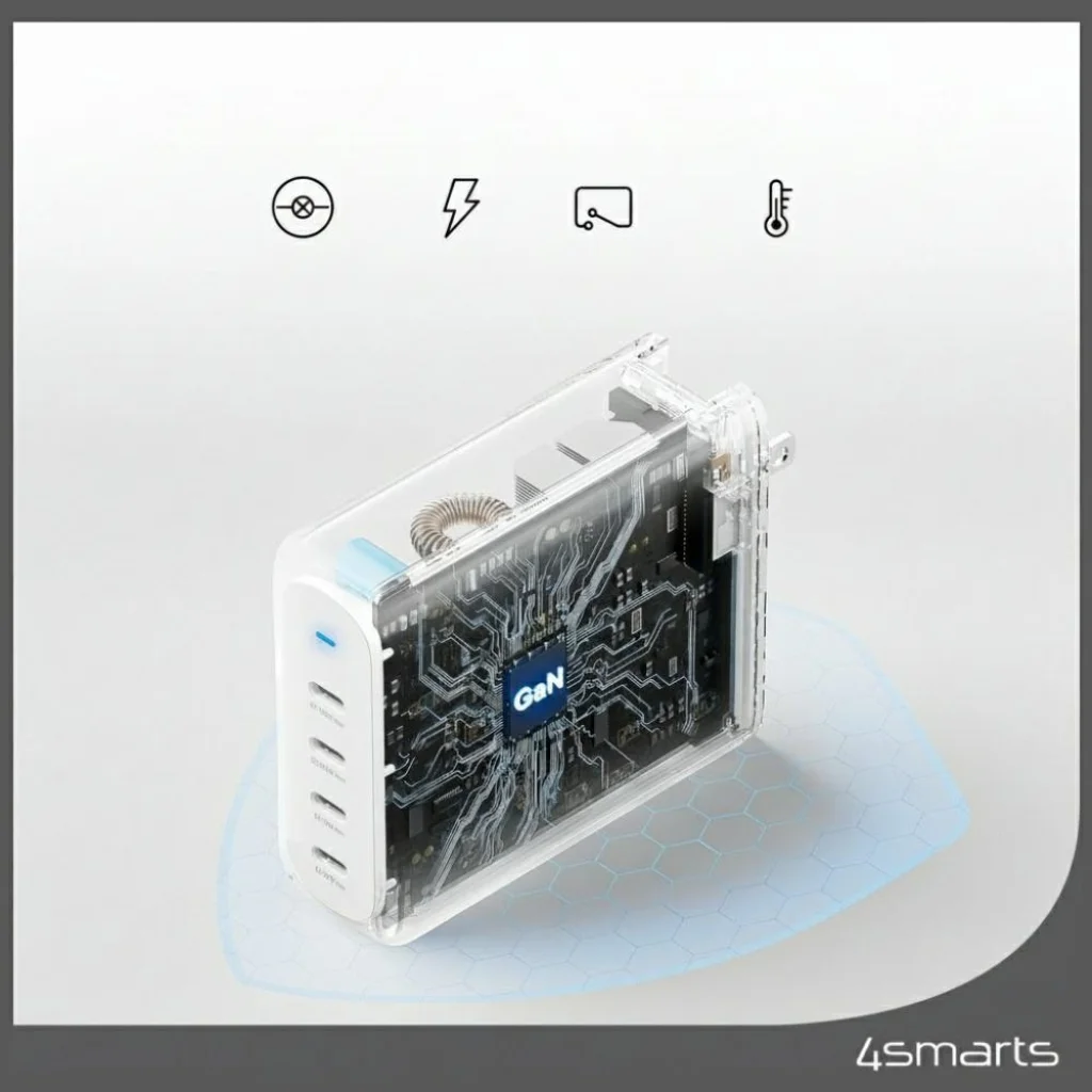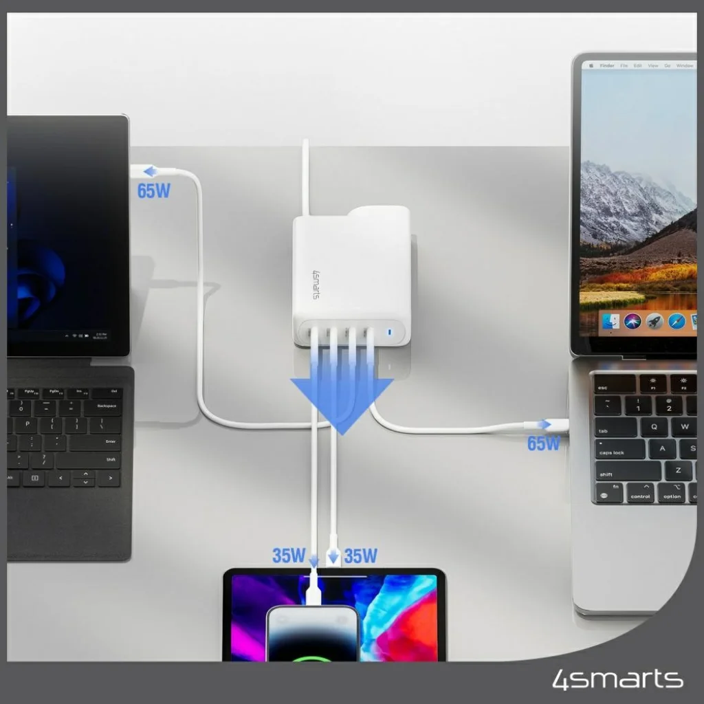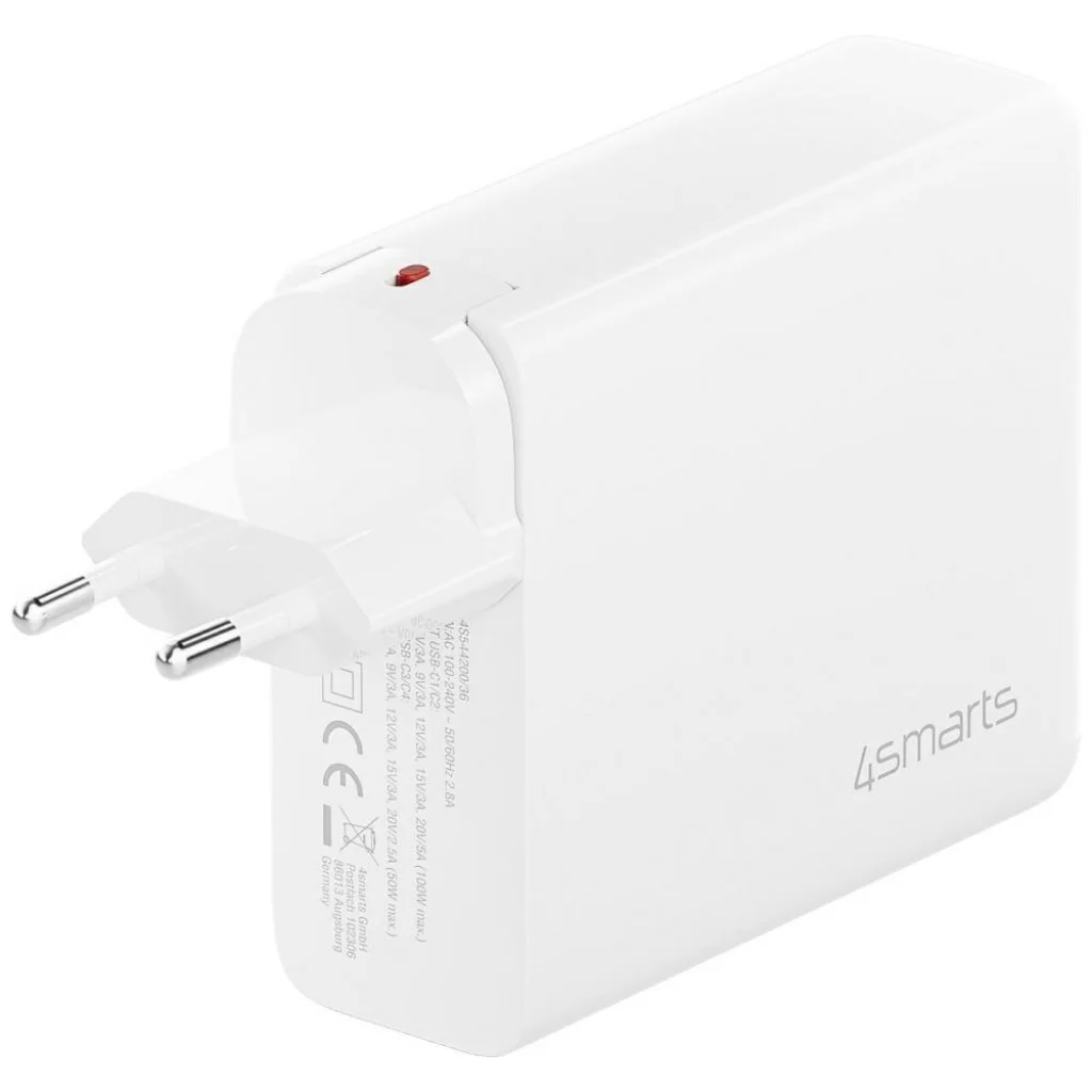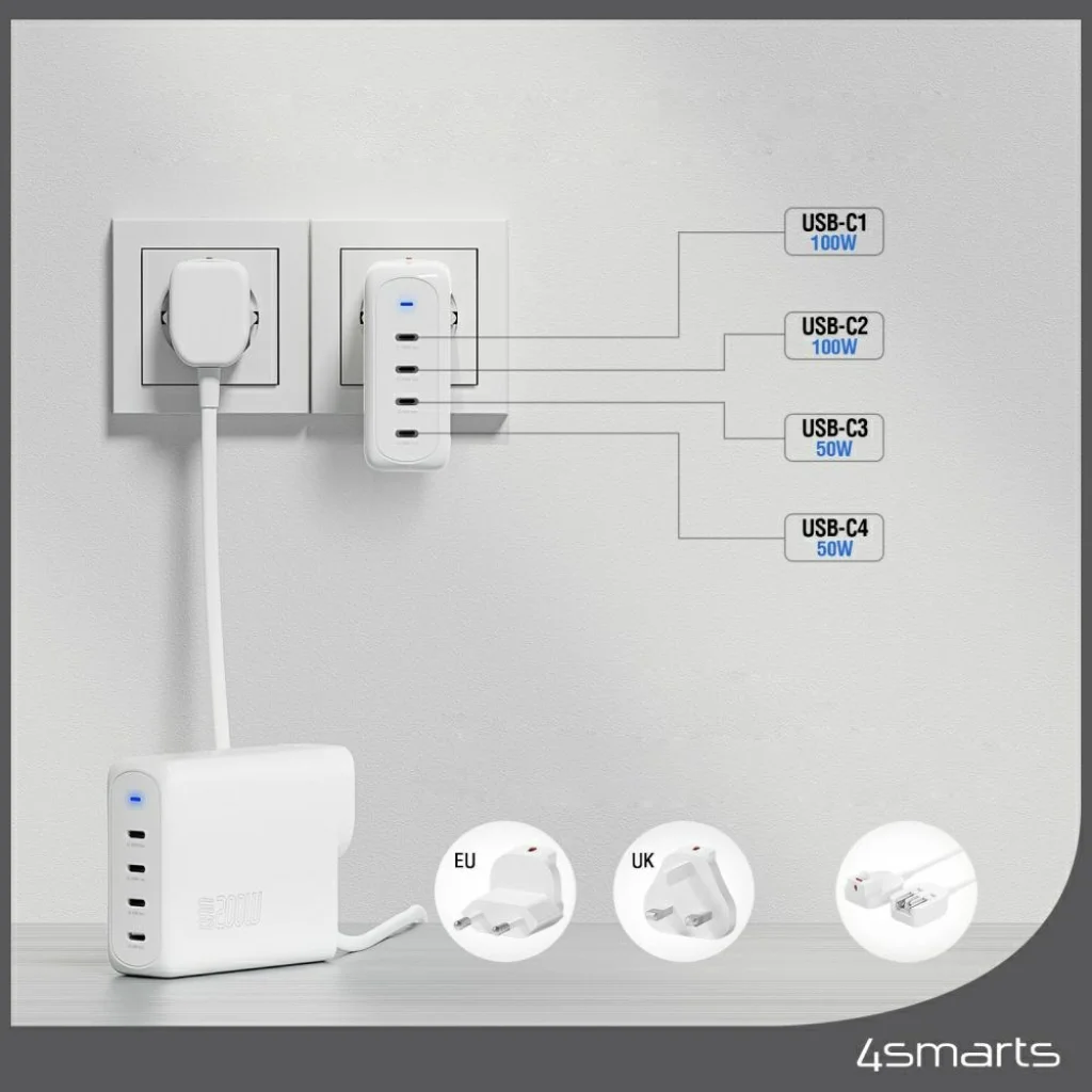 A fehér színű 4smarts GaN Flex Pro Travel 200W 4 USB-C hálózati töltő adapter egy fejlett megoldás azok számára, akik minden helyzetben maximális teljesítményt és rugalmasságot igényelnek. A modern technológiát kompakt, utazáshoz ideális kialakítással ötvözi.