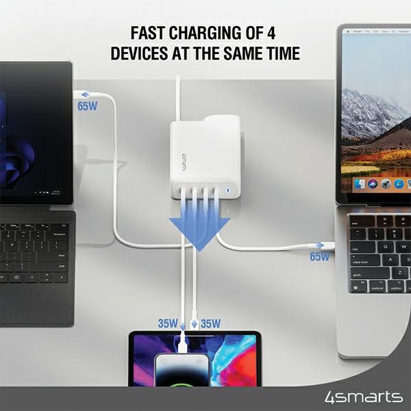 A 4smarts 200W teljesítményű GaN töltő lehetővé teszi akár négy eszköz egyidejű töltését összesen 200W teljesítménnyel. Ideális választás különböző eszközökhöz, például laptopokhoz, tabletekhez, okostelefonokhoz, és sok más kütyühöz, mint például játék konzolok, kamerák, drónok, powerbankok és Bluetooth audió eszközök. Az univerzális töltési megoldás ideális minden modern technológia kedvelő számára. Az USB-C hálózati adapter cserélhető EU/UK csatlakozókkal rendelkezik, amelyek közvetlenül a töltőhöz vagy a mellékelt 1,5 méteres hosszabbítóhoz csatlakoztathatók, így a töltési konfiguráció az igényeknek és helyzetnek megfelelően alakítható. A világ bármely pontján biztonságosan töltheted eszközeidet, a GaN technológia kompakt mégis hatékony energiagazdálkodást biztosít. A készülék rendelkezik fejlett technológiával a túlmelegedés, rövidzárlat és túlfeszültség elleni védelem érdekében. A gaN technológiájú USB-C töltővel vége a rendetlenségnek. Specifikációk: Polikarbonát anyagból készült, fehér színű, 20 × 9,5 × 4 cm méretű, súlya 0,530kg, 150cm hosszú kábel, támogatott gyors töltési protokollok, mint a Qualcomm® Quick Charge™ 3.0, Quick Charge™ 4+, USB Power Delivery 3.0, USB Power Delivery PPS. 1 db GaN Flex 200W 4C töltőt, 1 EU és 1 UK csatlakozót, valamint egy 1,5 méteres kábelt tartalmaz. Kompatibilis eszközök: iPhone 15 Pro, iPhone 15 Pro Max, Pixel 7, iPhone 15 Plus, Pixel 7 Pro, Pixel 8 Pro, Pixel 8, Laptop, Smartfon, Tablet, Smartwatch, Pixel 7a, iPhone 15.