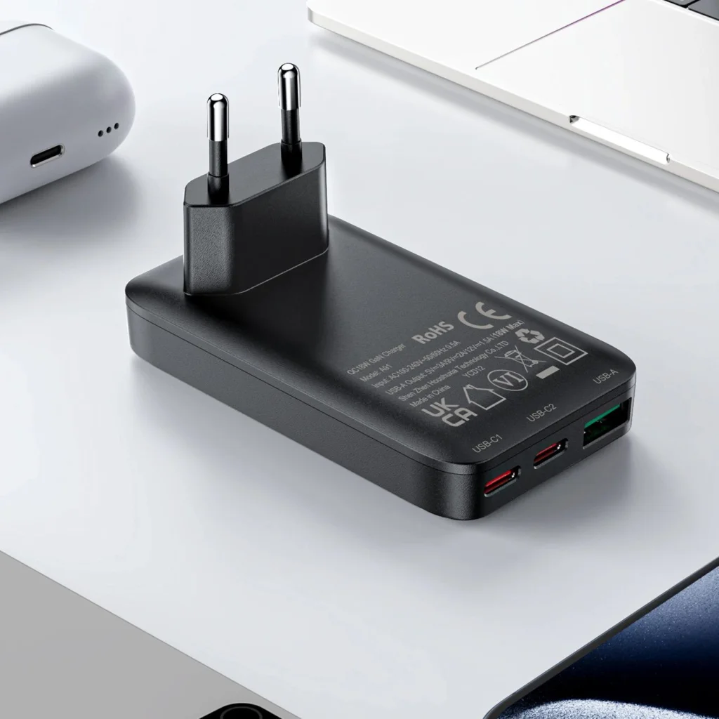 - Három töltési port: Két USB-C port és egy USB-A port lehetővé teszi három eszköz egyidejű töltését, így ez a töltő rendkívül praktikus megoldás bármilyen környezetben.