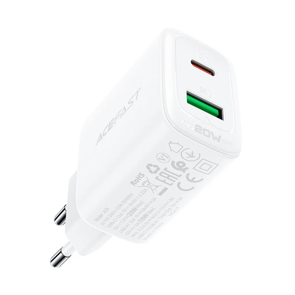 Acefast hálózati töltő adapter USB Type-C / USB 20W PPS PD QC3.0 AFC FCP fehér
