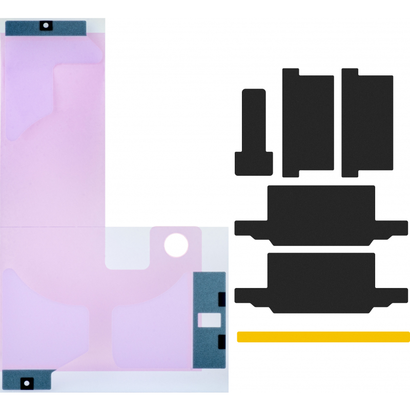 - Helyezze a sárga ragasztószalagot (a csomagban található) a BMS flex szalag hátuljára. Távolítsa el a védőfóliát, és rögzítse az új akkumulátor alsó részén (a BMS flex szalag eredeti pozíciója). Nyomja meg határozottan a megfelelő tapadás biztosítása érdekében.