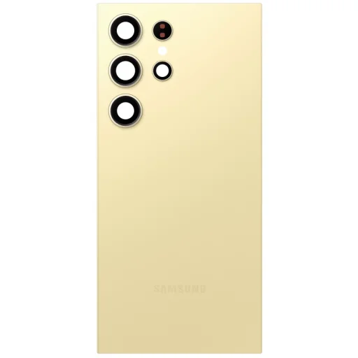 Akkumulátorfedél Samsung Galaxy S24 Ultra S928-hoz - Titán Sárga Pótlóalkatrész, amelyet a Samsung engedélyezett, a telefon sérült alkatrészének cseréjére szolgál. Tartalmazza a ragasztót és a kamera üveget.
