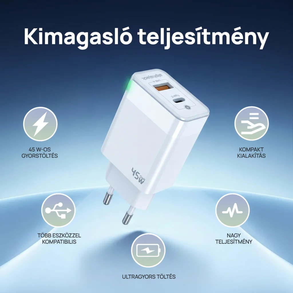 • Töltési technológiák: GaN, Power Delivery (PD), Quick Charge (QC)