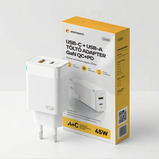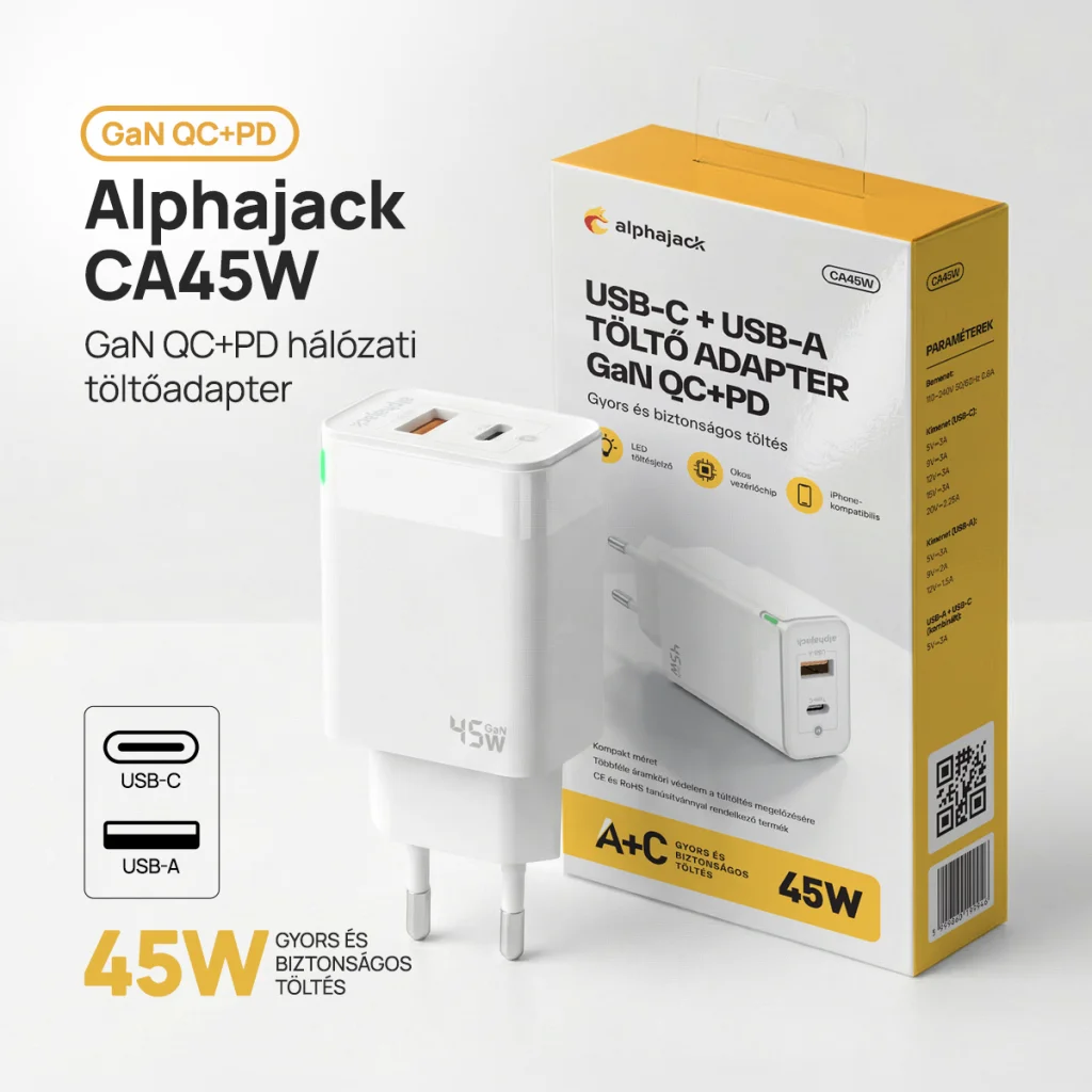 • Termék neve: Alphajack GaN CA 45W USB-C, USB-A hálózati töltőadapter