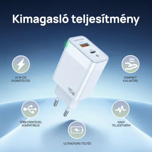 A töltő két kimeneti porttal rendelkezik: egy USB-C (Type-C) és egy USB-A porttal, így egyszerre akár két eszközt is tölthet. Az USB-C port önmagában akár 45W teljesítményt is képes leadni, támogatva a Power Delivery (PD) szabványt, ideális választás a legújabb eszközök gyors töltéséhez. Az USB-A port Quick Charge (QC) kompatibilis, önállóan akár 18W-os gyorstöltésre is képes.