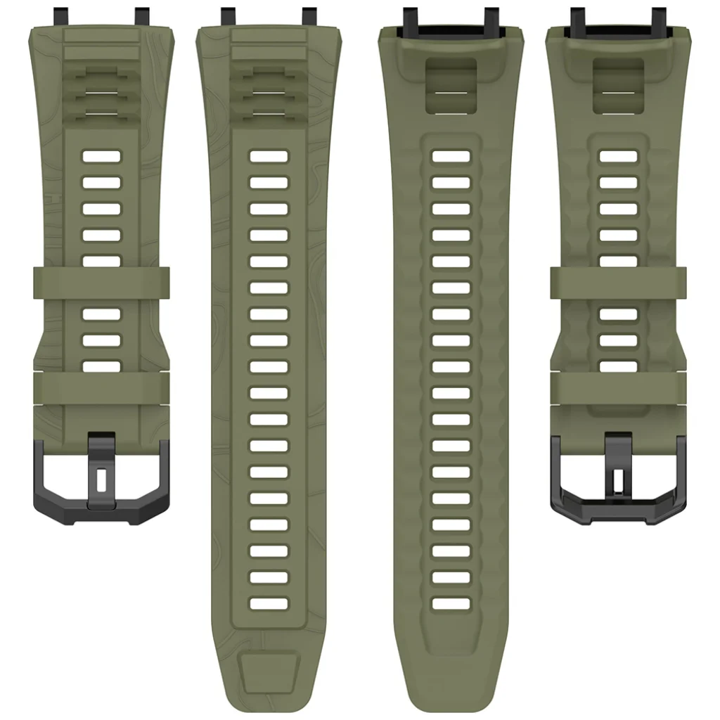 - Robusztus design és szín: A mély katonai zöld (military green) árnyalat robusztus és kalandos megjelenést kölcsönöz órájának. A szíj felülete texturált, a fekete, erős csat pedig tovább emeli az outdoor stílust.