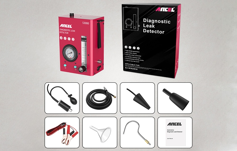 Az Ancel S3000 egy szivárgásérzékelő, amely lehetővé teszi számos járműrendszer hatékony diagnosztikáját füst vagy sűrített levegő használatával. A kompakt kialakítás nyomásmérőt, áramlásmérőt, független üzemmódvezérlést és számos biztonsági funkciót tartalmaz. A készüléket az EVAP, turbó, EGR, szívó-, üzemanyag-, hűtő-, kipufogó- és vákuumrendszerekhez tervezték. Támogatja az EGR rendszerek és a vákuumszivárgás vizsgálatát is. Teljesítménye, könnyű kezelhetősége és sokoldalúsága révén bármelyik műhelyben azonnal használható eszközzé válik.