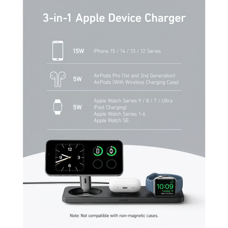 Anker MagGo 3in1 vezeték nélküli töltőállomás, 15W, 1.67A, fekete B25M1311
