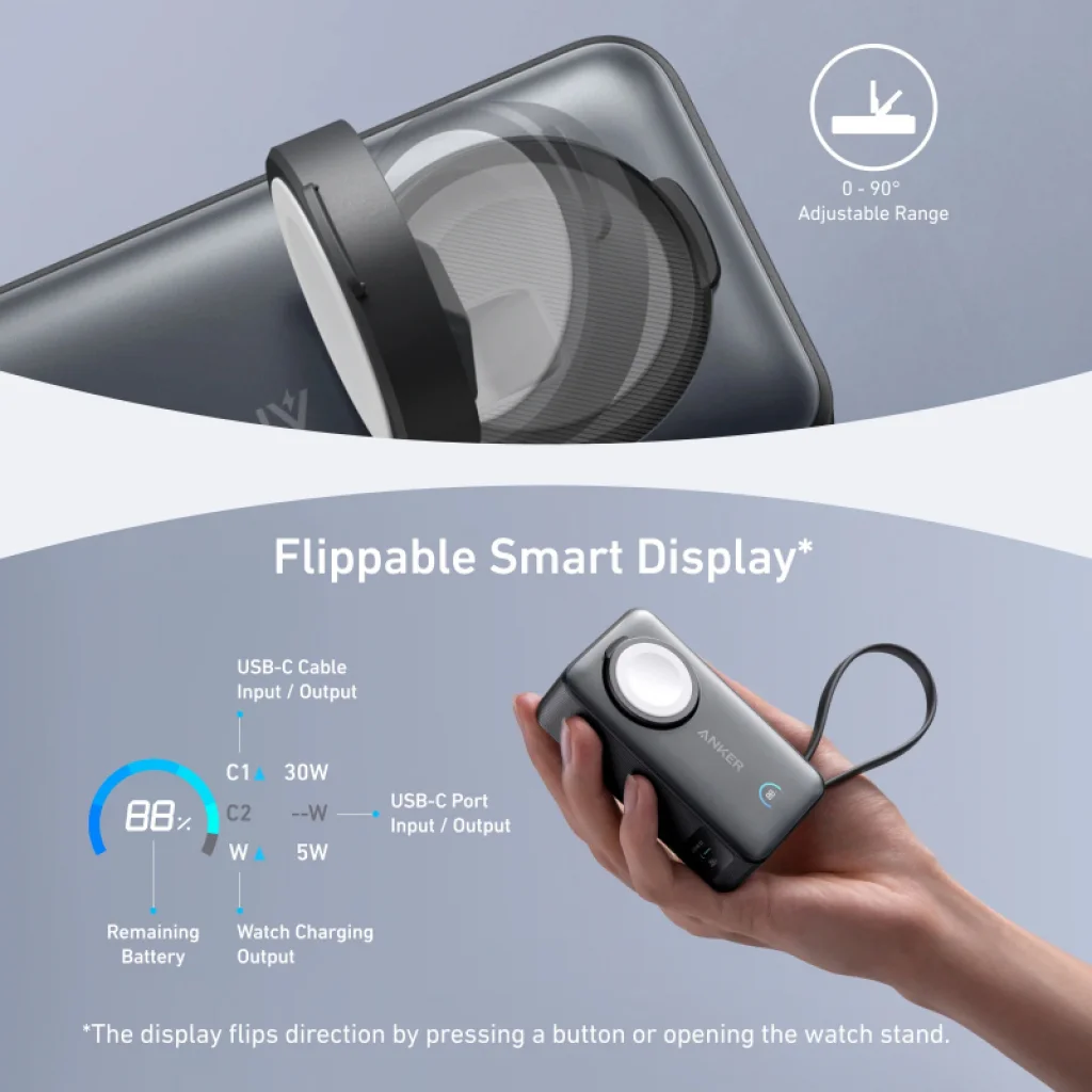 • Kétirányú gyors töltés: Akár 30W töltést biztosít az USB-C porton vagy a beépített kábelen keresztül (PD technológia), valamint 5W vezeték nélküli töltést az Apple Watch-hoz (QI technológia). Megjegyzés: Maximális kimenet 30W egyetlen USB-C port használata esetén, és 24W, ha az USB-C kábelt és USB-C portot egyidejűleg használja.