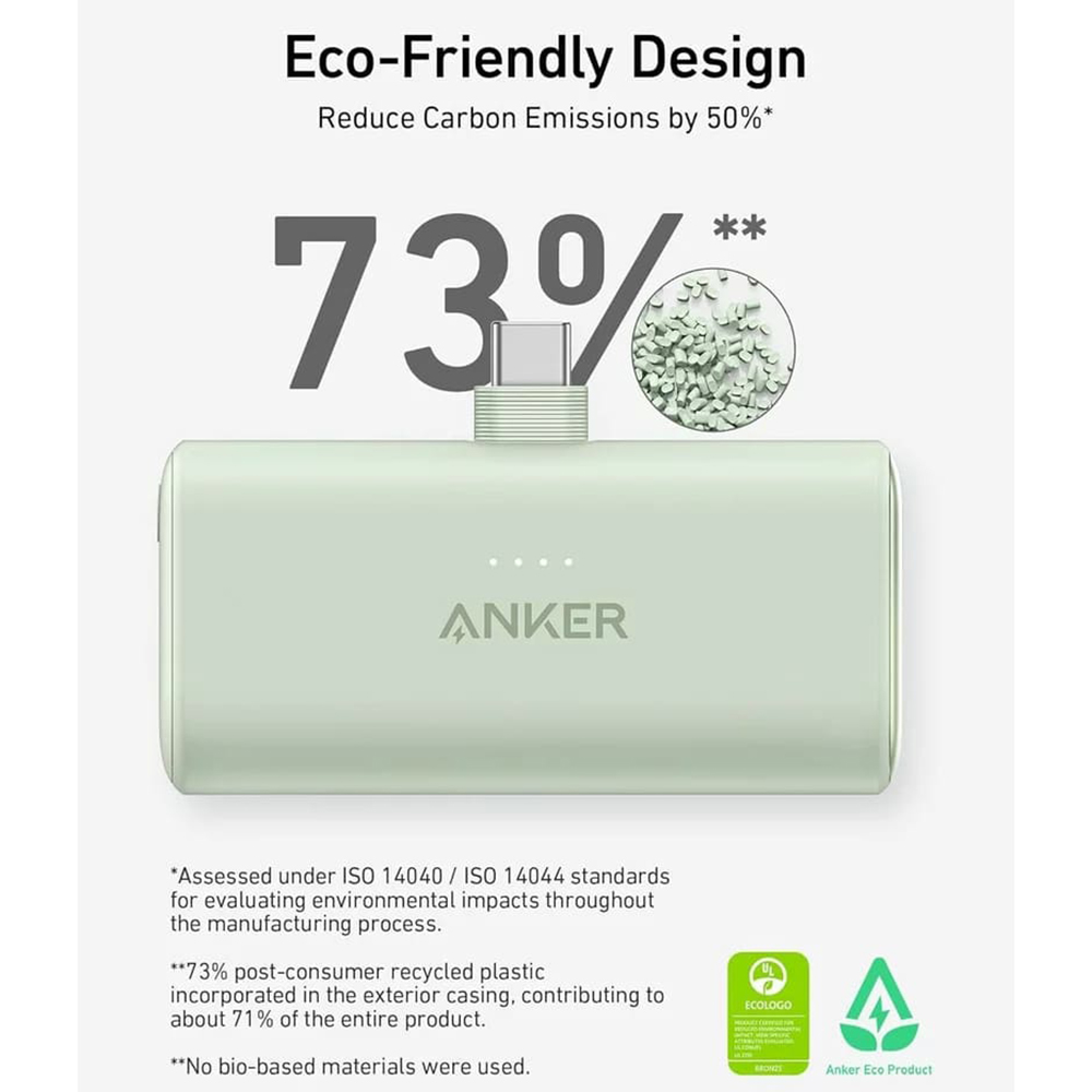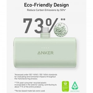 Az Anker elkötelezett a fenntarthatóság iránt. Az Anker Power Bank Nano külső borítása 73%-ban újrahasznosított műanyagból készül, amely az egész termék 71%-át teszi ki. Ez a környezetbarát megközelítés segít 50%-kal csökkenteni a szén-dioxid-kibocsátást a gyártás során (az ISO 14040 / ISO 14044 szabványok alapján értékelve), így nem csak eszközeidet, hanem a bolygót is óvod. Megjegyzés: A termék nem tartalmaz bio-alapú anyagokat.