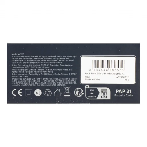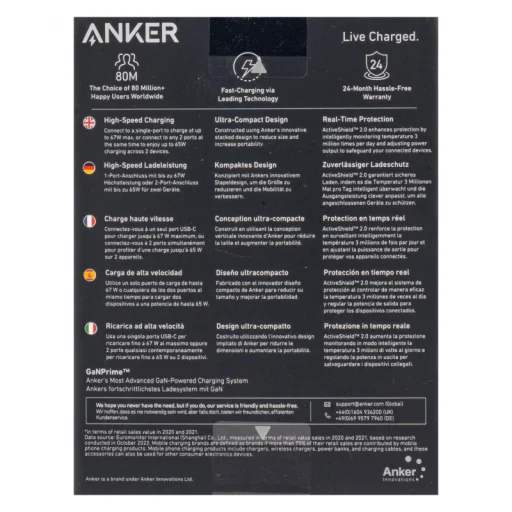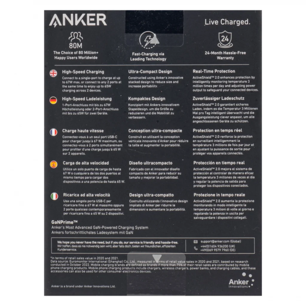Az Anker a világ több mint 80 millió elégedett felhasználójának választása. Az Anker Prime 67W fali töltő a kiváló minőség és a tartósság jegyében készült, és egy 24 hónapos gondtalan garanciával érkezik, biztosítva a hosszú távú elégedettséget.
