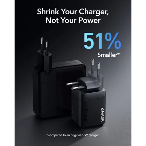 Az Anker Prime 67W fali töltő 51%-kal kisebb, mint egy eredeti 67W-os MacBook töltő, így könnyedén elfér zsebben vagy táskában, ideális választás utazáshoz és mindennapi használatra. Az Anker innovatív, egymásra rakott tervezési megközelítése (stacked design) tette lehetővé ezt a lenyűgöző méretcsökkentést, anélkül, hogy a teljesítményből engedne. A beépített GaNPrime™ technológia Anker legfejlettebb, GaN alapú töltési rendszere, amely garantálja a hatékony és gyors energiát.