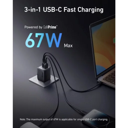 • Egyetlen eszköz töltése: A maximális kimenet eléri a lenyűgöző 67W-ot (USB-C porton keresztül), biztosítva a laptopok és más nagy teljesítményű eszközök rendkívül gyors feltöltését.