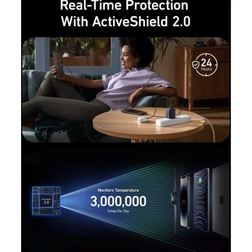 Az Anker Prime töltőbe épített ActiveShield 2.0 rendszer valós időben figyel és véd, biztonságos és megbízható töltést biztosítva minden eszköze számára. Ez a fejlett rendszer naponta több mint 3 millió alkalommal ellenőrzi a hőmérsékletet, és intelligensen szabályozza a kimeneti teljesítményt, megvédve csatlakoztatott eszközeit a túlmelegedéstől és egyéb kockázatoktól. A 24 órás védelem garantálja a nyugalmat.