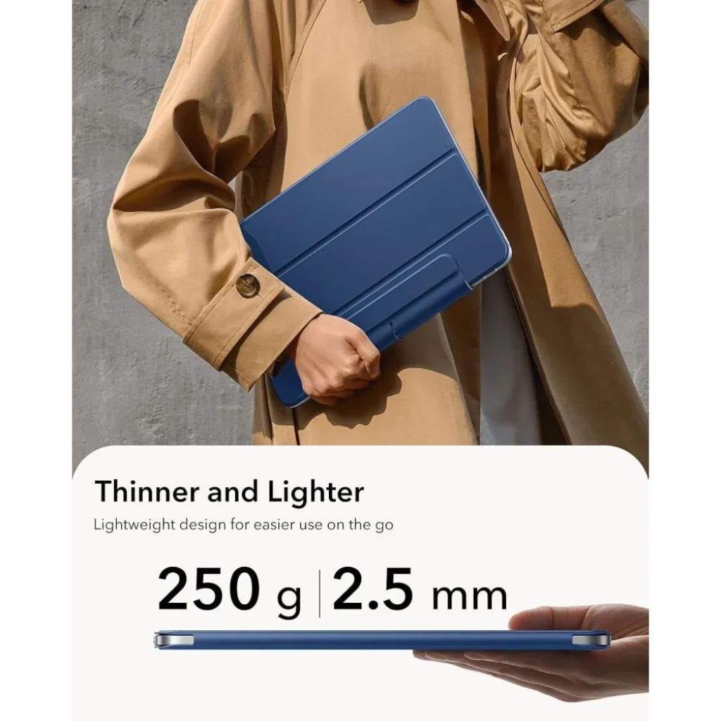 Az ESR Rebound Mágneses tok különleges kialakítása lehetővé teszi, hogy gyorsan praktikus állvánnyá alakuljon, amely bármilyen szögben megtámasztja az iPadot. Ez különösen hasznos filmnézés, munka, rajzolás vagy weboldalak böngészése során. A mágneses fedél nemcsak az érintőképernyőt óvja a karcolódástól, hanem modern eleganciát is kölcsönöz az eszköznek. A tok külön helyet biztosít az Apple Pencil számára, így a ceruza mindig kéznél van és biztonságosan tárolható.