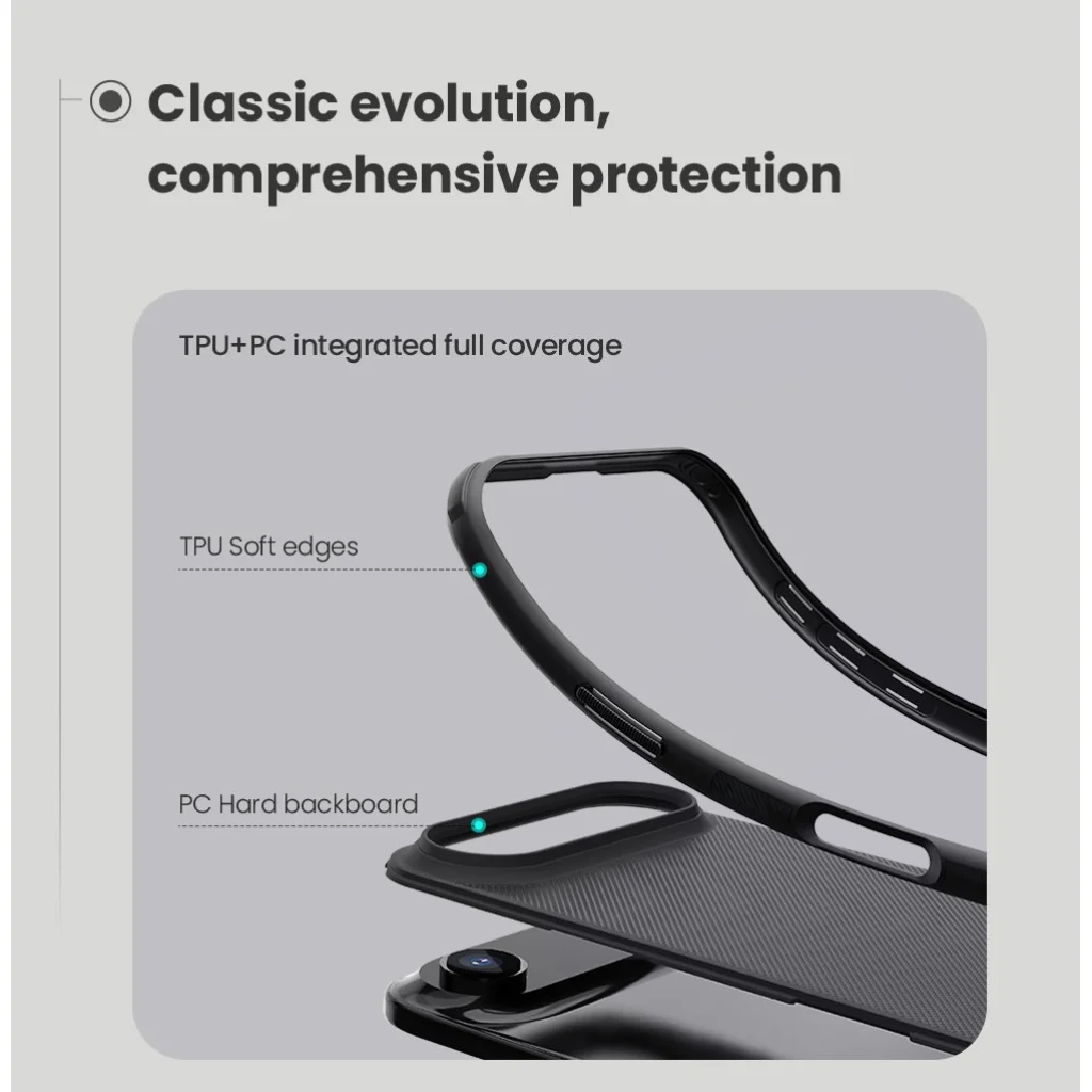 A Nillkin Super Frosted PRO tokot a kettős anyagösszetétel teszi különlegessé: a hátlap egy kemény és rendkívül strapabíró műanyagból készült, amely hatékonyan áll ellen a karcolásoknak és ütéseknek, míg az oldalak rugalmas, puha TPU anyagból állnak. Ez a kombináció biztosítja a maximális ütéscsillapítást és a teljes élvédelmet, miközözben a telefon kényelmesen illeszkedik a kezébe. A felület matt textúrájú, így nem csúszik, és ujjlenyomat-mentes marad.