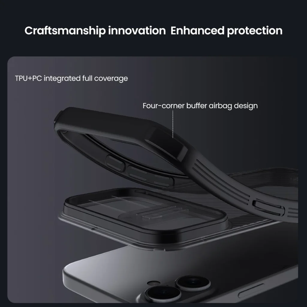 A Nillkin CamShield PRO egy egyedülálló tok csúsztatható kamera lencsevédővel. A klasszikus CamShield-tól eltérően, két anyagból áll. A tok hátulja erős és tartós műanyagból készült, beleértve a kamera fedelét is. A tok kerete lágyított TPU műanyagból készült, a telefon széleinek és sarkainak legjobb védelme érdekében. Mindkét anyag nagyon ellenálló a kopással szemben, de az ujjlenyomatokkal és zsírokkal szemben is. A precíz kivágások a vezérlőelemek és a szükséges csatlakozók számára kényelmes telefonhasználatot biztosítanak.