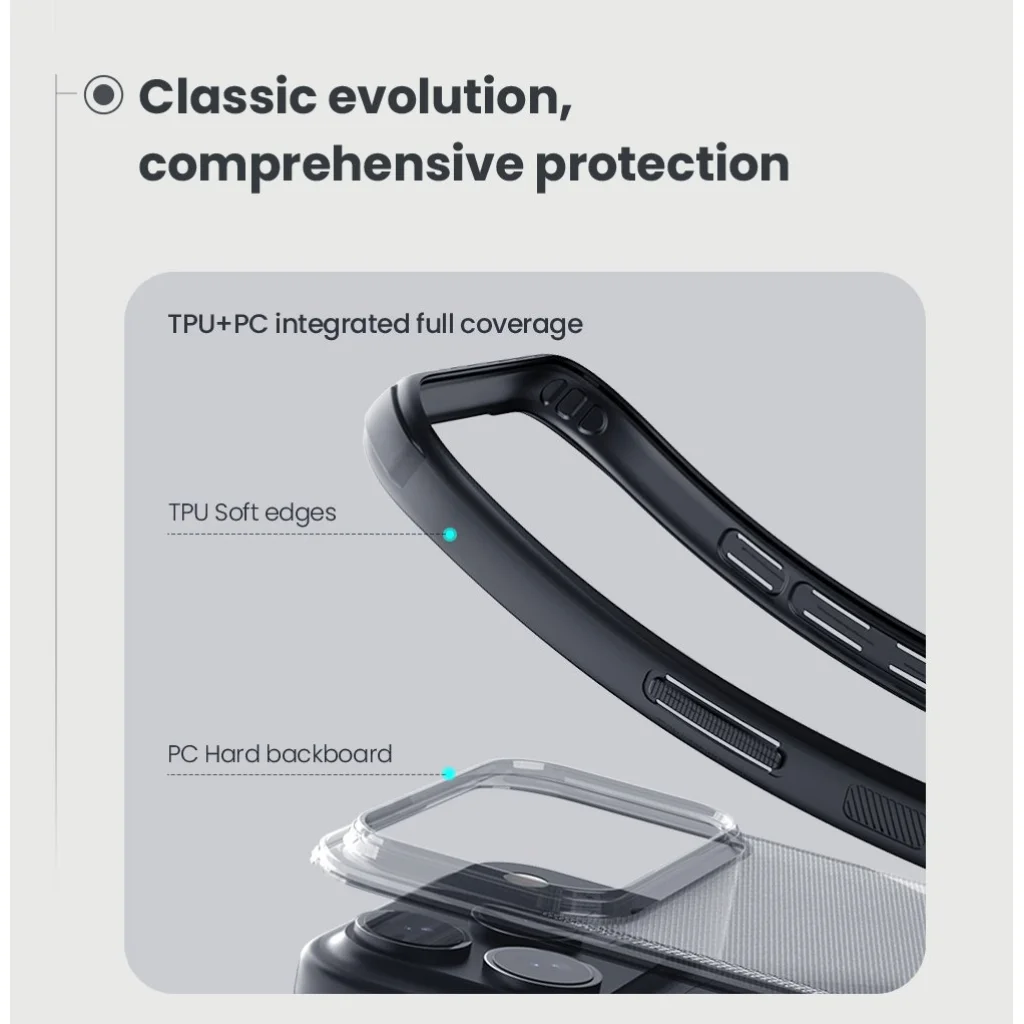 Kemény és tartós műanyagból áll a hátsó részen, míg a szélei TPU puha műanyagból készültek.