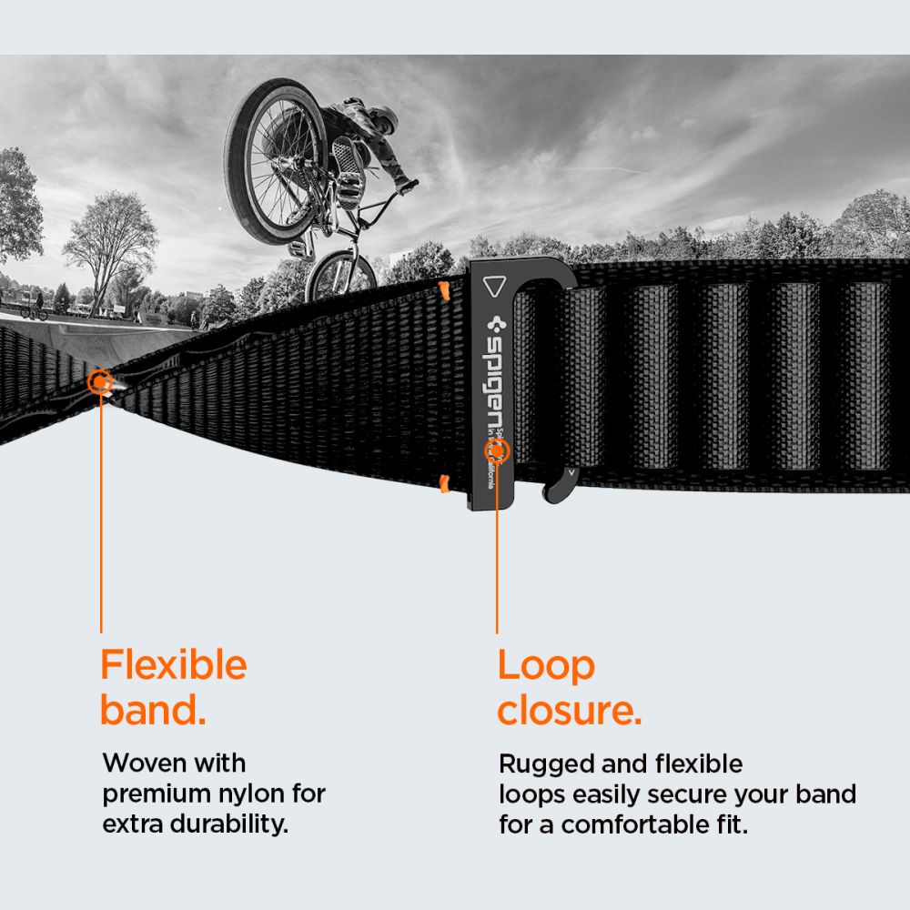 A Spigen WBF1 szíj elegáns és modern kiegészítő, amely tartós nylonból készült, ötvözve a sportos karaktert és a minimalista stílust. Masszív hook buckle típusú csattal és hurokzárral van ellátva, ami biztonságos és stabil illeszkedést biztosít mindennapi használat és intenzív tevékenységek során. A belső textúra finom mintával növeli a tapadást és megakadályozza a szíj elcsúszását a csuklón, a rugalmas kialakítás pedig magas viselési kényelmet garantál egész nap. Egyszerű állítórendszerének köszönhetően a szíj könnyen igazítható bármilyen csuklóra, könnyű és tartós szerkezete pedig kiválóan alkalmas mind edzésre, mind elegáns öltözetekhez.
