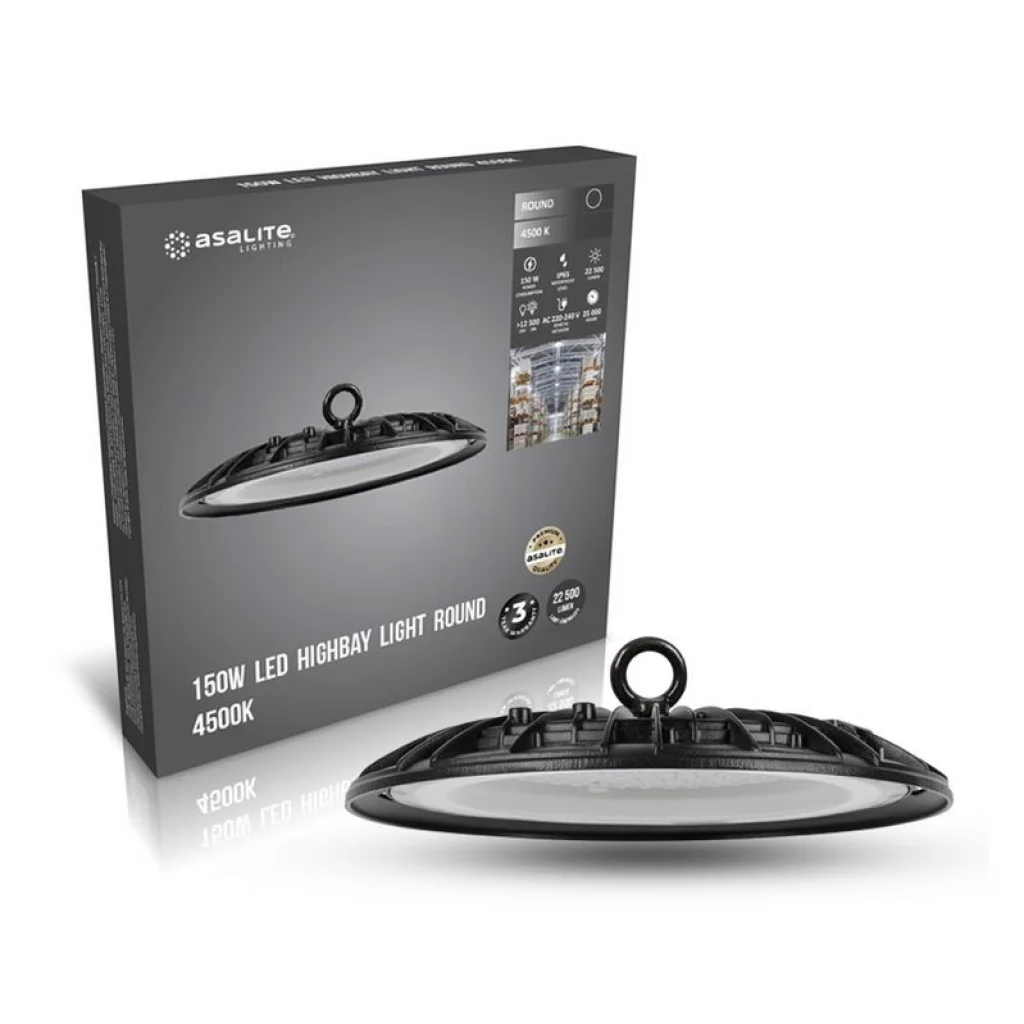Az Asalite LED Csarnokvilágító 150W 4500K a 150W teljesítmény mellett 22500 lumen fényerősség elérésére képes. A teret 90°-ban képes bevilágítani, így optimális választás raktárak, logisztikai központok, ipari létesítmények, autószalonok, nagy belmagasságú terek, üzletközpontok megvilágítására.