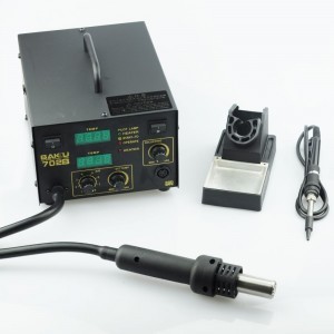 Forrólevegős forrasztóállomás - BAKU BK-702B. Kifejezetten SMD komponensek, mint például SOIC, QFP, PLCC és BGA forrasztására tervezték. Kiváló választás kis elektronikai eszközök, például mobiltelefonok és videokamerák, valamint háztartási készülékek javításához. Beépített antisztatikus rendszer védi a forrasztott komponenseket a károsodástól és tekerőgombos hőmérséklet-szabályozás könnyíti meg a munkát. Különálló kompresszorral felszerelve a légáramlás növelése érdekében, ami növeli a forrasztópáka "fújásának" erejét. Intelligens hőmérséklet-kijelző mutatja az aktuális hőmérsékletet és a beállításkor történt változásokat, például ha a hőmérsékletet 300°C-ról 250°C-ra állítjuk, a kijelző kezdetben 250°C-ot mutat, majd fokozatosan csökkenő hőmérsékletet mutatva indul 300°C-ról. Forrólevegős pisztoly hatékony bontóforrasztást biztosít. Széles alkalmazási terület - a forrasztóállomás alkalmas zsugorításra, szárításra, lakk eltávolítására, viszkozitás eltávolítására, jég eltávolítására, előmelegítésre és ragasztós forrasztásra. 5 különböző méretű fúvókát tartalmaz, így a saját forrasztási igényekhez alkalmazkodhat. Műszaki adatok: Teljesítmény: 270W Szivattyú teljesítménye: 45W Bemeneti feszültség: 220-240V FORRÓ LEVEGŐ állítható levegő hőmérséklet: 100-420°C Állítható légáramlás: 0.3-24L / perc