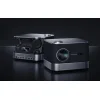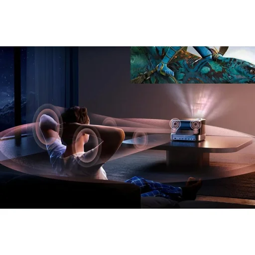 Teljes hangzás négy hangszóróból A projektor négy hangátalakítóval van felszerelve: két teljes tartományú hangszóróval, két magas hangszóróval és egy basszusmembránnal. Ez az elrendezés valósághű, térbeli hangzást hoz létre, amely minden oldalról körülveszi a nézőt. A 2.2 csatornás rendszer biztosítja, hogy a hang közvetlenül elérje a hallgatót, erőteljes basszussal és jobb elmélyüléssel a film, játék vagy koncert cselekményében.