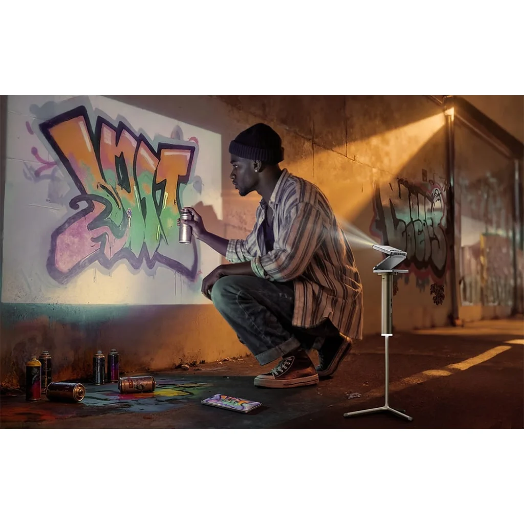 A átgondolt kialakítás lehetővé teszi, hogy a projektort szinte bármilyen szögben elhelyezze, így könnyen alkalmazkodik bármilyen térhez és felhasználási helyzethez. Akár a nappali falán, a hálószoba mennyezetén vagy a szabadban nézi a filmet, a gyakorlatilag korlátlan szögbe állíthatóság teljes szabadságot biztosít az elhelyezéshez. Ez a megoldás kiküszöböli a kiegészítő állványok és tartók szükségességét, növelve a mobilitást és a kényelmet.