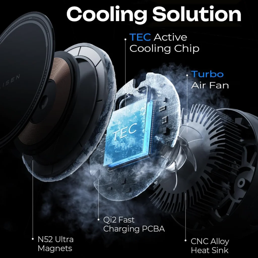 A Lisen W701 igazi különlegessége a beépített aktív hűtési rendszer, amely a hagyományos ventilátoros hűtőknél sokkal hatékonyabb. A forradalmi TEC (Peltier) hűtőchip és a turbó légventilátor kombinációjával ez a tartó akár 45°F (kb. 25°C) hőmérsékletcsökkenést is képes elérni. Egyetlen gombnyomással aktiválható a gyors hűtés (a hópehely ikonnal jelölt gombon), amely megakadályozza a telefon túlmelegedését intenzív használat és gyors töltés közben is. A CNC-ötvözetből készült hűtőborda tovább növeli a hőelvezetési hatékonyságot, így a telefonja mindig optimális hőmérsékleten üzemelhet.