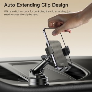 - Automatikus kioldás, kézi rögzítés: Az "Press Here" feliratú gomb megnyomásával a tartó oldalsó karjai automatikusan kinyílnak. Egyszerűen helyezze be telefonját, majd kézzel szorítsa össze a karokat a biztonságos rögzítéshez.