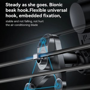 A Yesido C312 stabil és biztonságos rögzítést kínál a légbeömlőre. A "bionikus csőr" kialakítású kampó rugalmas és univerzális, beágyazott rögzítést biztosít, amely szilárdan a helyén tartja a tartót, elkerülve a leesést vagy a kilazulást még rázós utakon is. Fontos, hogy a kampó kialakítása védi a légkondicionáló lamelláit a sérülésektől.