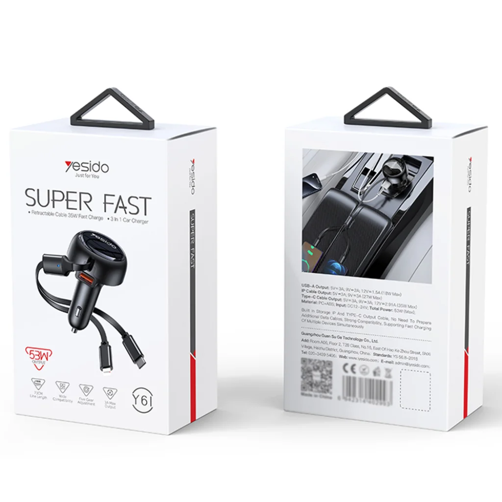 Fedezze fel a Yesido Y61 autós töltőt, amely forradalmasítja a mobil eszközök töltését utazás közben. Ez a fekete, elegáns és rendkívül funkcionális töltő minden modern autó elengedhetetlen kiegészítője, biztosítva, hogy eszközei mindig teljesen feltöltve legyenek, bárhová is tartson.