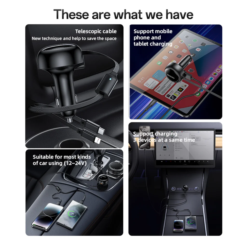 A Yesido Y61 egyik legkiemelkedőbb jellemzője a két, teleszkóposan visszahúzható töltőkábel (Type-C és Lightning). A 73 cm-es maximális hossznak köszönhetően kényelmesen elérhetőek, ugyanakkor használaton kívül teljesen visszahúzhatók, így rendet és tisztaságot tartva az autóban. Nincs többé kusza kábelrengeteg!