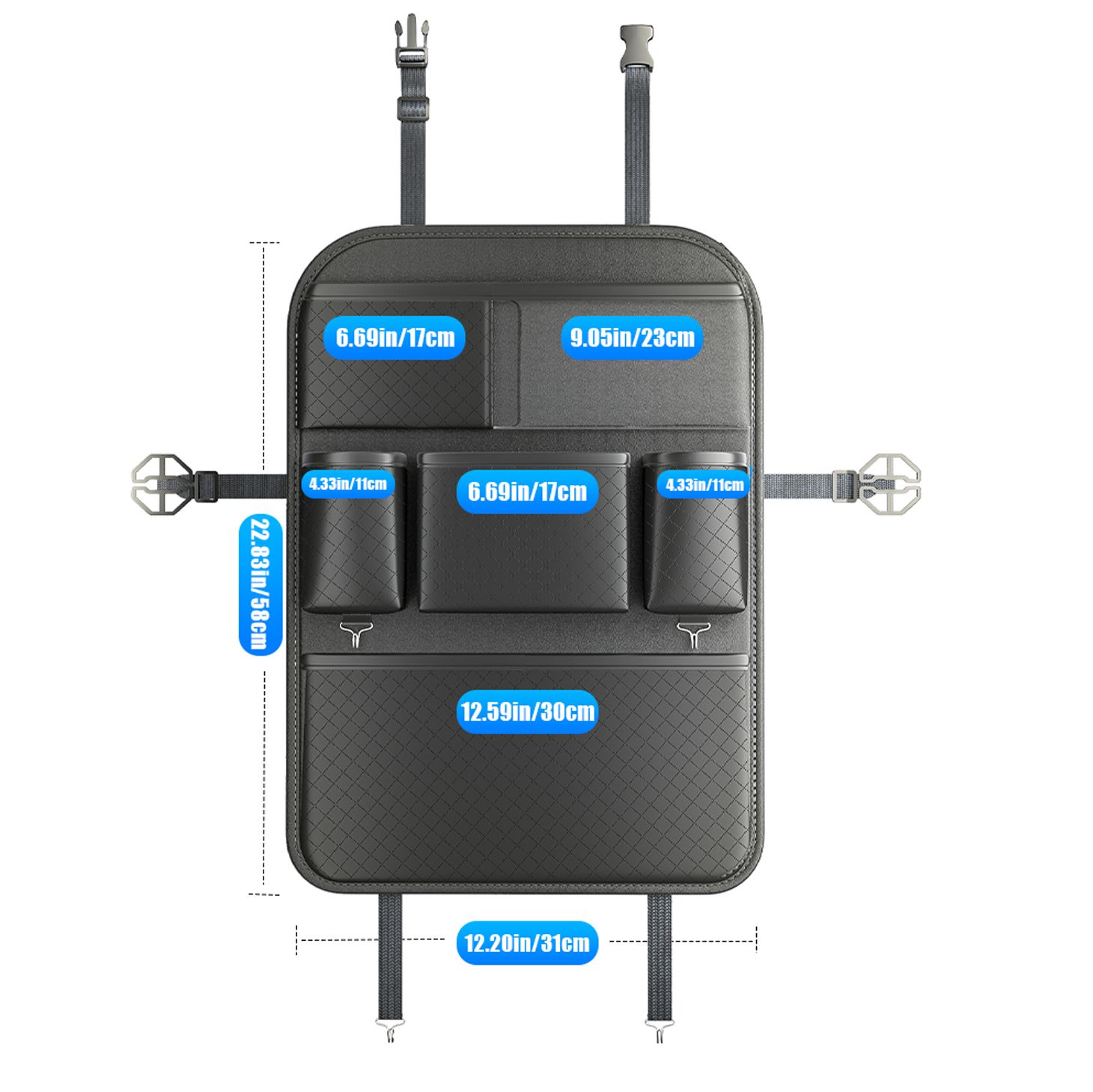- Multifunkcionális tárolás: Számos különböző méretű zseb és rekesz biztosítja a telefonok, tabletek, italok, dokumentumok, játékok és egyéb apróságok rendezett tárolását.