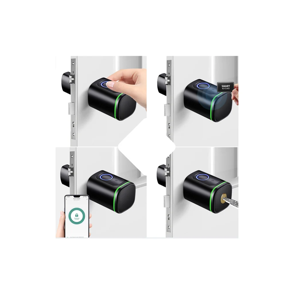 Az SDL-S1-S90 betét négy különböző módszert kínál az ajtó kinyitásához. Az ujjlenyomat gyors és biztonságos felhasználói azonosítást tesz lehetővé, míg az IC kártya könnyen használható, így gyerekek és idősek számára is alkalmas. A Tuya alkalmazás távoli hozzáférési vezérlést biztosít, míg a hagyományos kulcs vészhelyzeti opcióként szolgál.