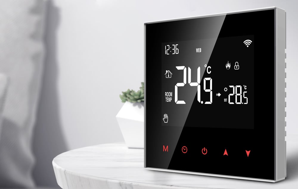 Az Avatto WT100 másik előnye az LCD kijelző. Ezen keresztül értesülhet a beállított működési módról, hálózati kapcsolatról, beállított hőmérsékletről vagy az aktivált biztonsági zárról. Ráadásul a termosztát kijelzi az aktuális időt. Az LCD kijelző fényerejét is állíthatja vagy teljesen kikapcsolhatja. Így minden fontos információ kéznél van - elég egy pillantást vetnie rá!