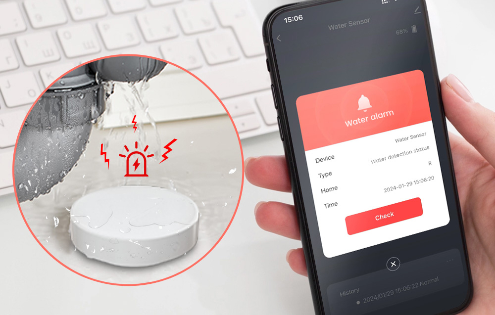 Azonnali értesítések és távfelügyelet: Ha vizet észlel, az érzékelő valós idejű riasztást küld az alkalmazásba. Ez lehetővé teszi a gyors reagálást - elzárhatja a vízellátást, kikapcsolhatja az áramot, vagy kérhet valakit, hogy avatkozzon be, akár akkor is, amikor Ön nincs otthon. Minden eseményt rögzít az előzmények között, így teljes képet kap arról, hogy mikor és hol történt a probléma.