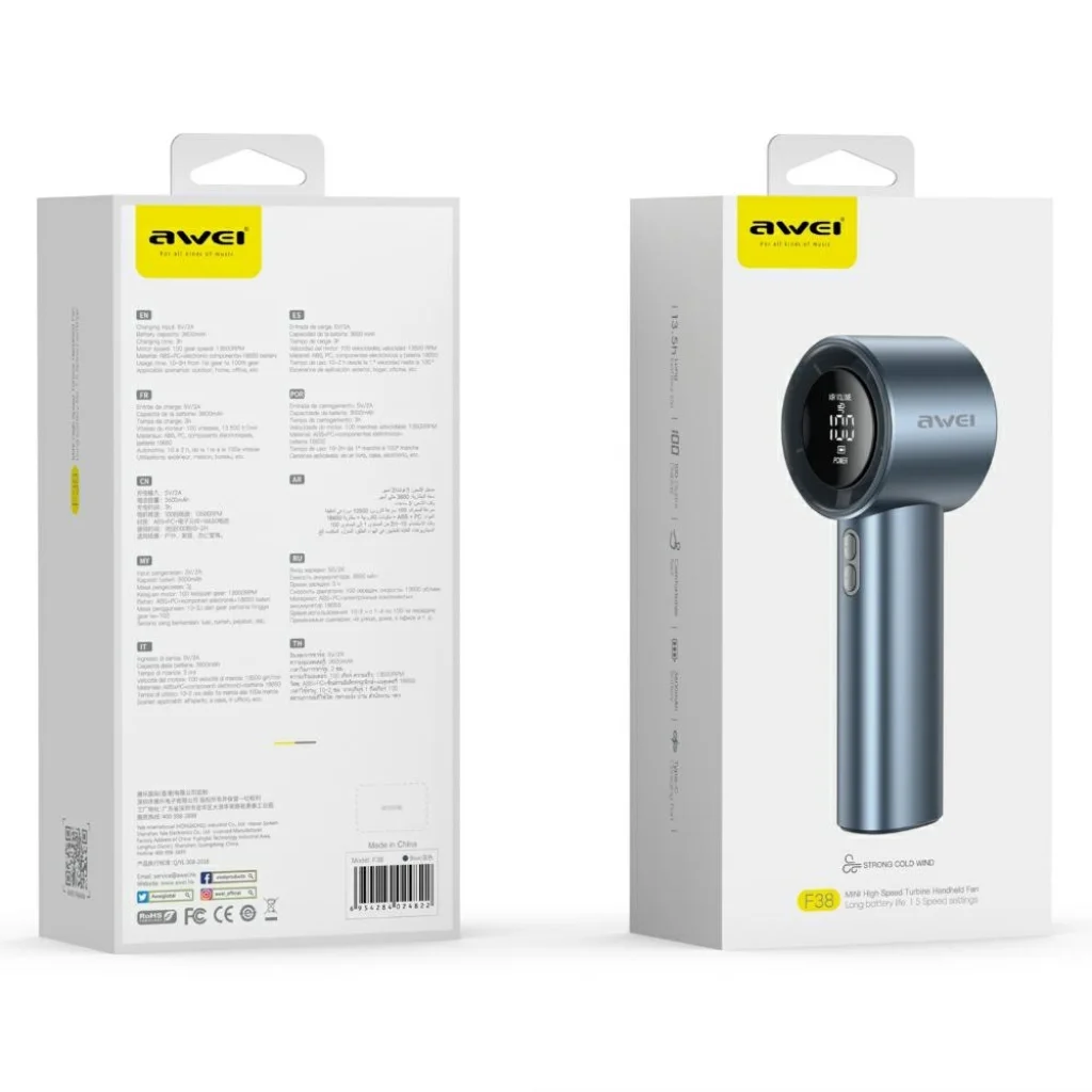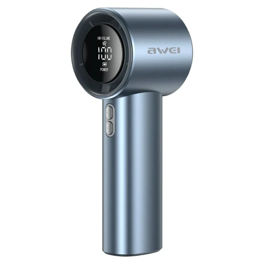 A kézi ventilátor AWEI F38 MINI kék színben az elegáns megjelenést és funkcionalitást ötvözi egy praktikus formában. A 59 x 60 x 160,5 mm-es méreteknek és mindössze 212 g súlynak köszönhetően tökéletesen illeszkedik a kézbe és a táskába. Az ABS és PC műanyagból és magas minőségű elektronikai alkatrészekből készült burkolat tartósságot és felhasználói kényelmet biztosít. Az eszközt egy nagy kapacitású, 3600 mAh-s akkumulátor hajtja, ami megbízható társsá teszi utazás, munka vagy otthoni hőség idején. A minimalista design maximális használhatósággal párosul.