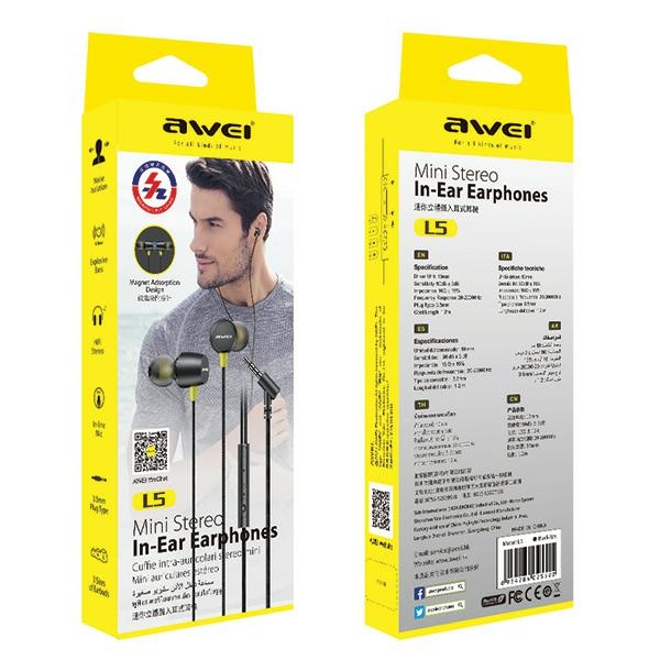 AWEI L5 sztereó fülhallgató Összetett funkciók Élvezze kedvenc zenéjét a megbízható AWEI L5 sztereó fülhallgatóval. Jó hangminőség, jobb zajcsökkentés, kényelmes viselet és hívások fogadása – mindezt kínálja az L5 modell.
