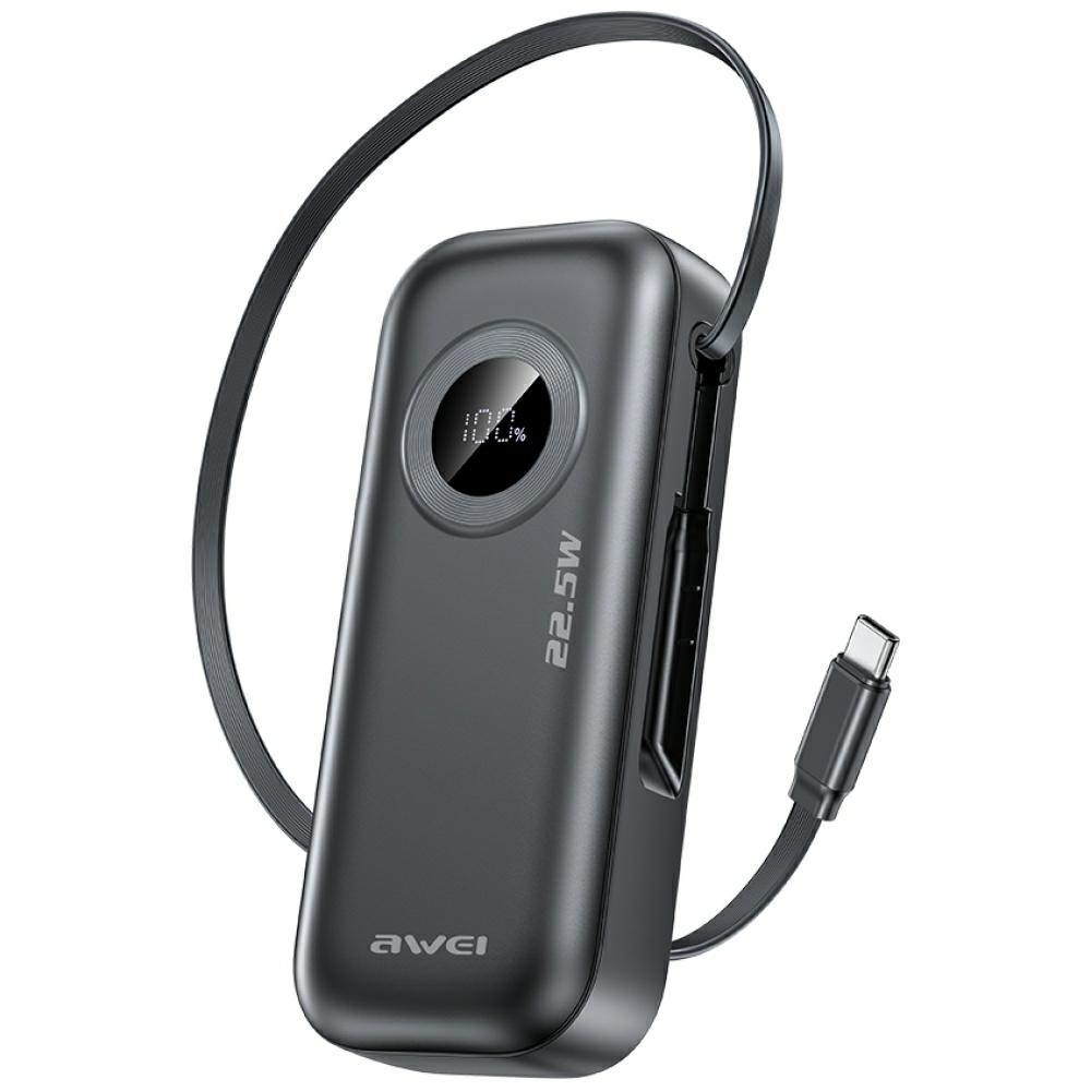 AWEI PA-9 PowerBank tökéletes kombinációja a hatékonyságnak, modern dizájnnak és praktikusságnak. 10,000 mAh kapacitásával és 22.5 W teljesítményével gyorsan feltöltheti okostelefonját, fejhallgatóját vagy más eszközeit. A beépített, visszahúzható 60 cm-es USB-C kábel kiküszöböli a további kábelek szállításának szükségességét – csak húzza ki, és már indulhat is! Az eszköz elején található egy digitális kijelző, amely valós időben mutatja a powerbank töltöttségi szintjét, így mindig tudni fogja, mennyi energia áll rendelkezésre.