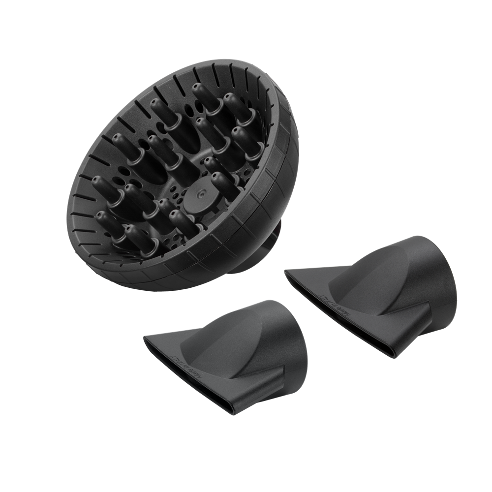 - Két professzionális szűkítőfej (Made in Italy): A különböző szélességű fúvókák lehetővé teszik a levegő precíz irányítását. Az egyik keskenyebb fej ideális az egyenes, pontos frizurák kialakításához, míg a szélesebb fejjel gyorsabban száríthat és simíthat. Az "Made in Italy" felirat a kiváló minőséget és a gondos kivitelezést garantálja.