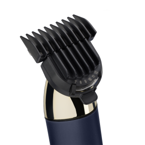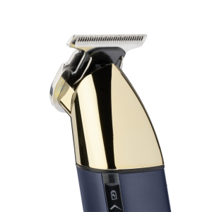 A szakállvágó nemcsak funkcionális, hanem esztétikus is. A mély, elegáns kék színű házat arany színű fém elemek teszik még vonzóbbá, ami prémium megjelenést kölcsönöz a készüléknek. A beépített kék LED-es akkumulátor-indikátor nemcsak modern hatást kelt, hanem pontos tájékoztatást nyújt az akkumulátor töltöttségi szintjéről, így sosem éri váratlanul, ha töltésre van szükség. Az ergonómikus kialakítás kényelmes fogást biztosít, a vezeték nélküli használat pedig maximális szabadságot nyújt a formázás során.