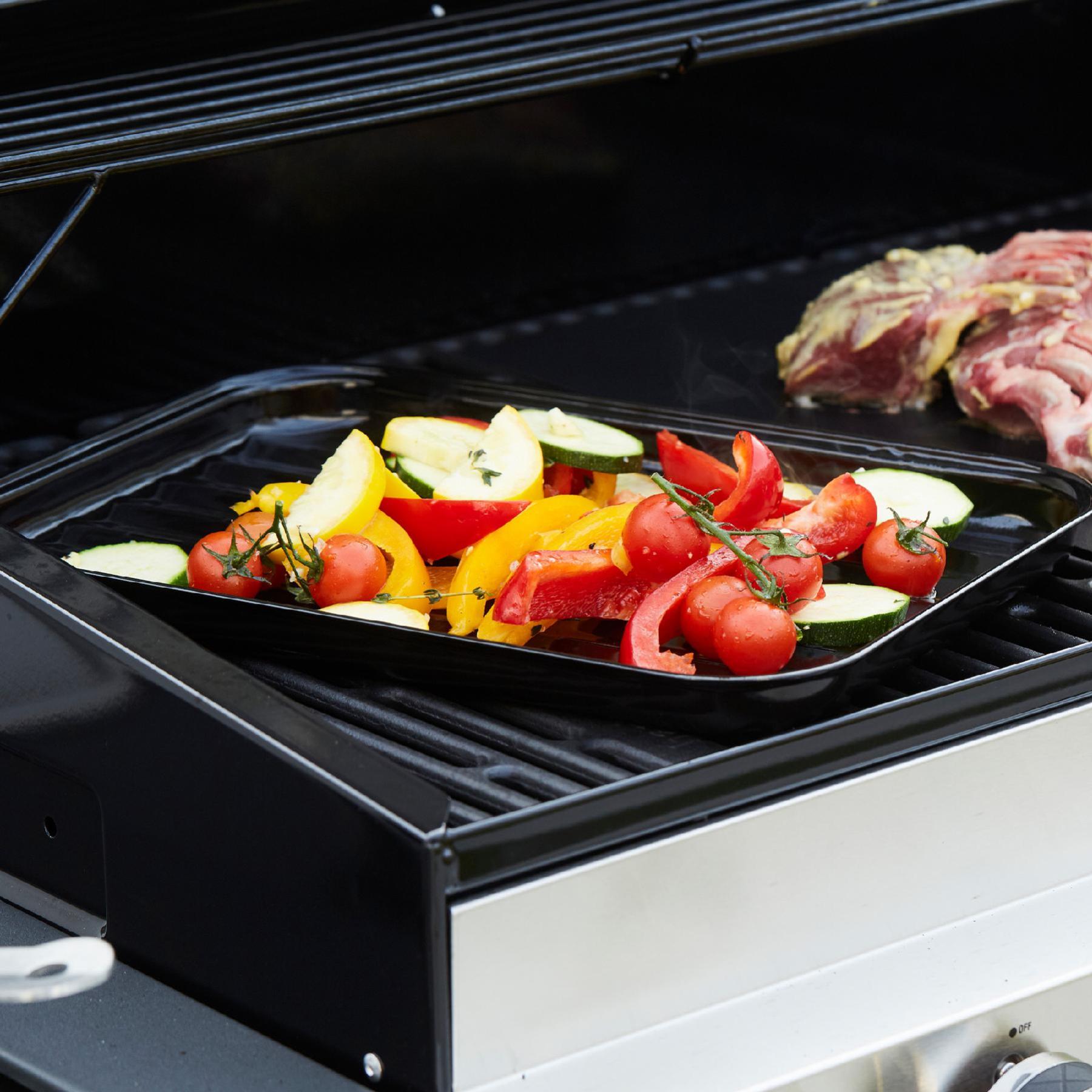 Ez a praktikus, 34,5x24cm méretű grilltálca kiváló minőségű, zománcozott anyagból készült, így ellenáll a magas hőmérsékletnek és megakadályozza, hogy az ételmaradékok közvetlenül a grillre kerüljenek. Faszenes és gázgrillekkel egyaránt használható, így bármilyen típusú grillezéshez tökéletes választás.