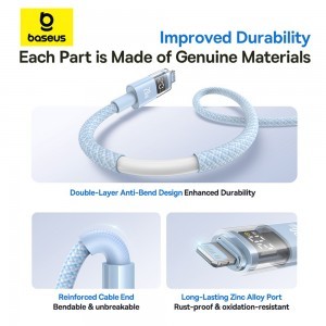 A Baseus Display 2 kábel különlegessége a Lightning csatlakozón található táj-alapú digitális kijelző. Ennek köszönhetően egyetlen pillantással láthatja a pontos töltési teljesítményt (Wattban), így könnyedén megkülönböztetheti a gyors és a hagyományos töltést. A hagyományos kábelekkel ellentétben, ahol a töltési állapot gyakran rejtve marad, ez a funkció maximális kontrollt és átláthatóságot biztosít, kiemelve a "Flash Charging Visible at a Glance" élményt.