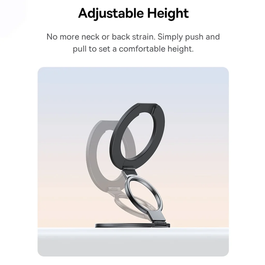 Mondjon búcsút a nyaki és hátfájdalmaknak! Az állítható magasságú kialakításnak köszönhetően egyszerűen húzhatja és tolhatja a tartót a legkényelmesebb magasság beállításához. A 360°-ban forgatható mágneses talp lehetővé teszi, hogy könnyedén megtalálja az optimális nézési szöget, akár vízszintesen, akár függőlegesen szeretné használni telefonját, sőt, akár lebegő, "felfüggesztett" pozíciót is kialakíthat.