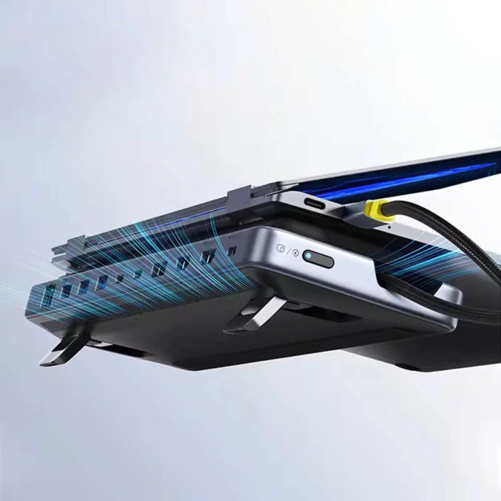 • Beépített laptop/tablet állvány: Az innovatív, összecsukható állvány funkció ergonomikus pozíciót biztosít laptopjának vagy tabletjének, javítva a légáramlást és a felhasználói kényelmet.