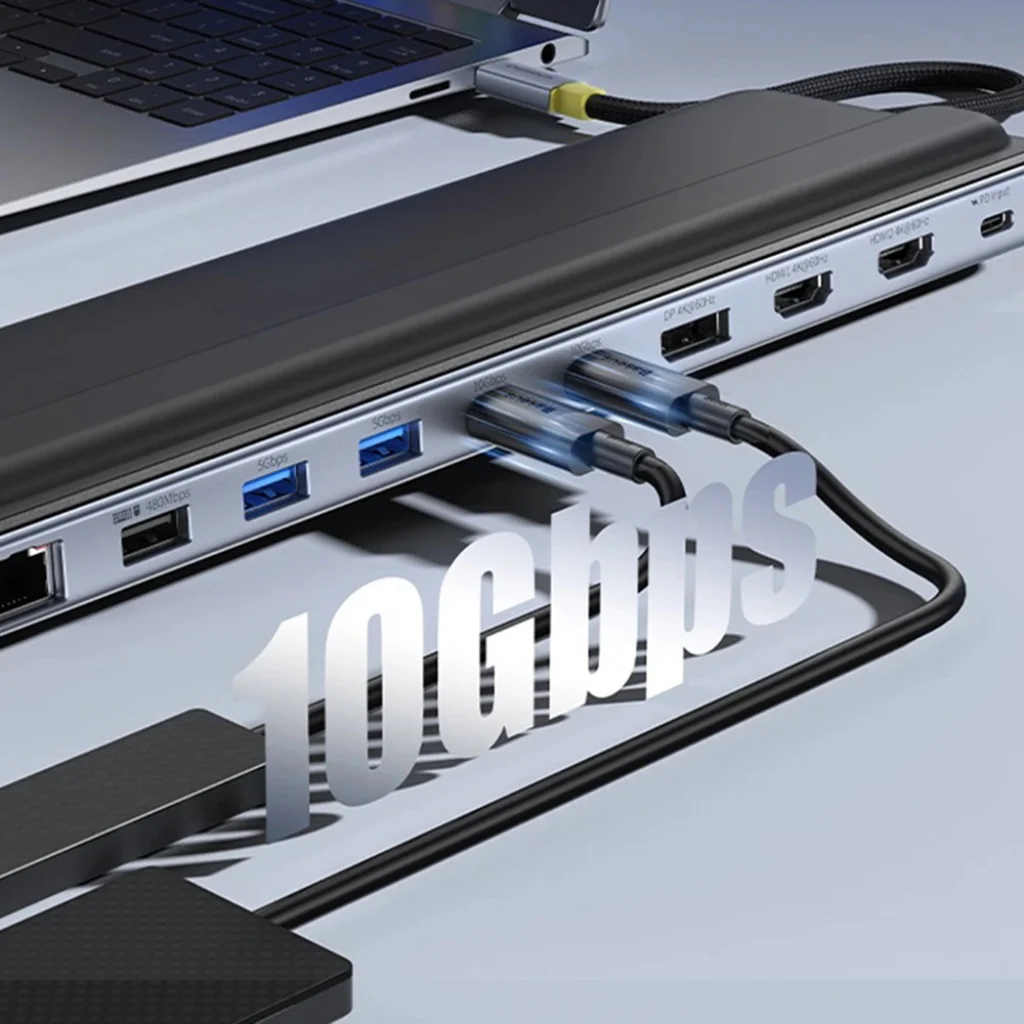 • 12-in-1 multifunkcionalitás: Egyetlen USB-C porton keresztül bővíti eszközét 12 különböző porttal, kiváltva a kábelrengeteget és a különféle adaptereket.