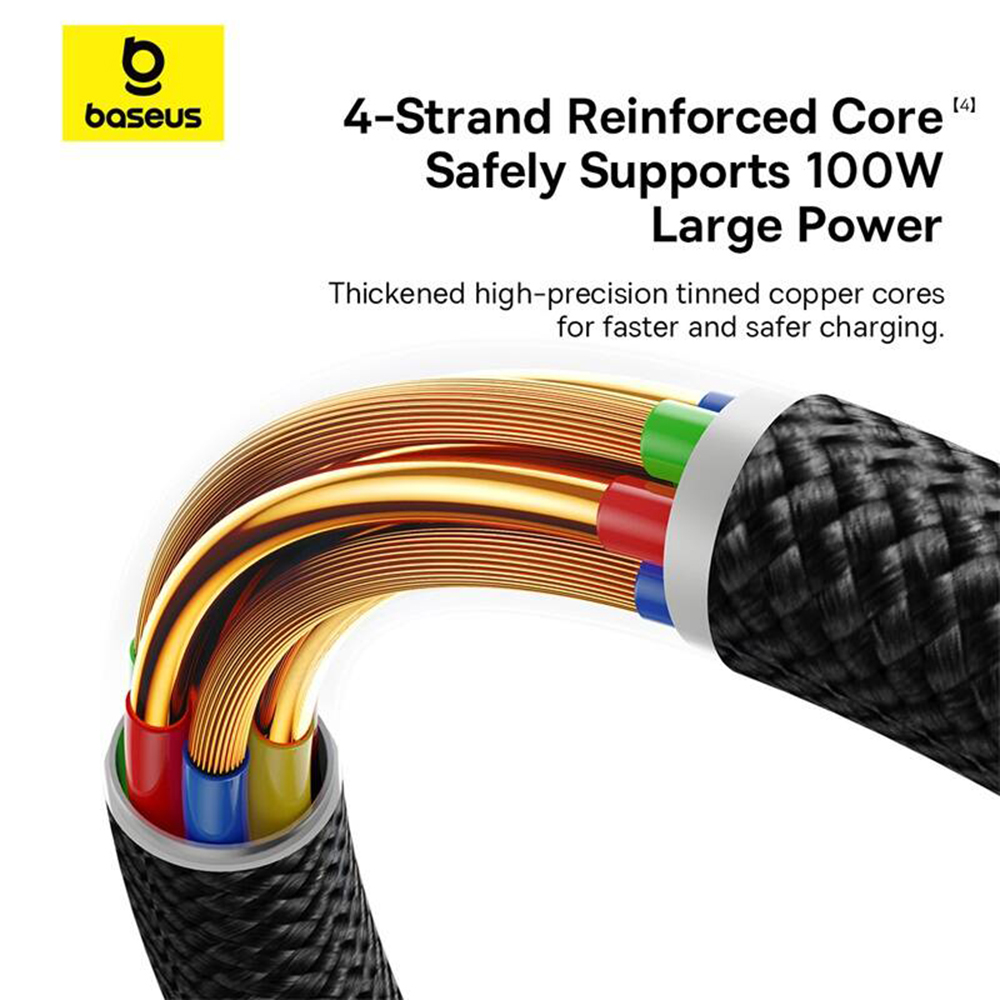 - Erősített 4 szálas mag: A Baseus Dura kábel belső felépítése 4 szálas, megvastagított, nagy pontosságú ónozott rézmagokat tartalmaz. Ez a gondos kialakítás nemcsak a gyorsabb és biztonságosabb töltést teszi lehetővé, hanem kivételes stabilitást is biztosít nagy teljesítmény átvitele során, minimalizálva a hőtermelést és a feszültségesést.