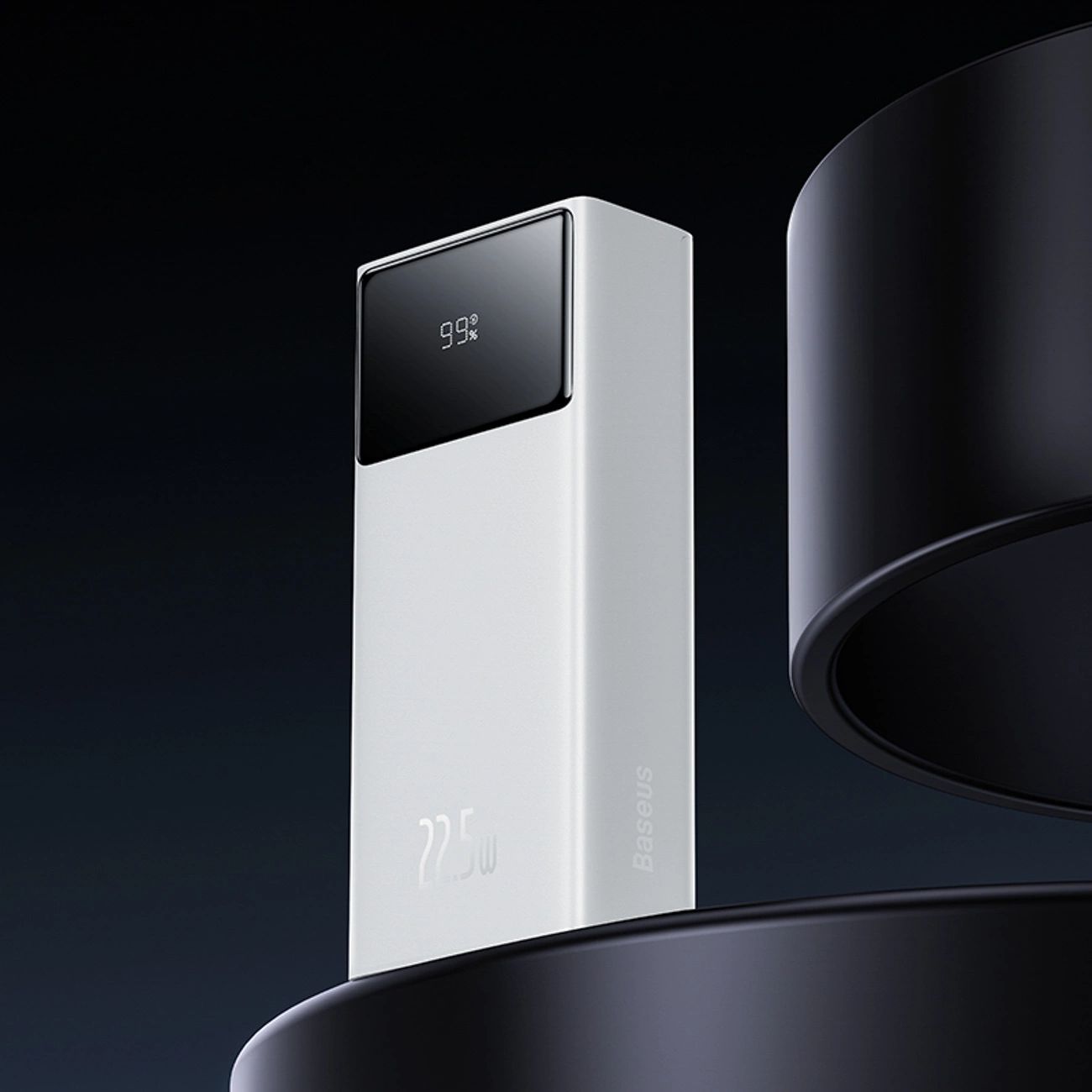 A modern, letisztult fehér design és a masszív műanyag ház nemcsak esztétikus, hanem tartós védelmet is nyújt a mechanikai sérülések ellen. Az integrált, elegáns fekete LED kijelző valós időben, pontosan mutatja a powerbank töltöttségi szintjét százalékban (pl. „99%”), így mindig tudni fogja, mennyi energia áll még rendelkezésére. A készülék oldalán diszkréten feltüntetett "22.5W" felirat is utal a belső erőre.